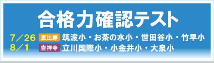 合格力確認テスト エリア別に絞った内容のテストです ・恵比寿(対象校:筑波小・お茶の水小・世田谷小・竹早小) 7月26日(日) ・吉祥寺(対象校:立川国際小・小金井小・大泉小) 8月1日(土) |